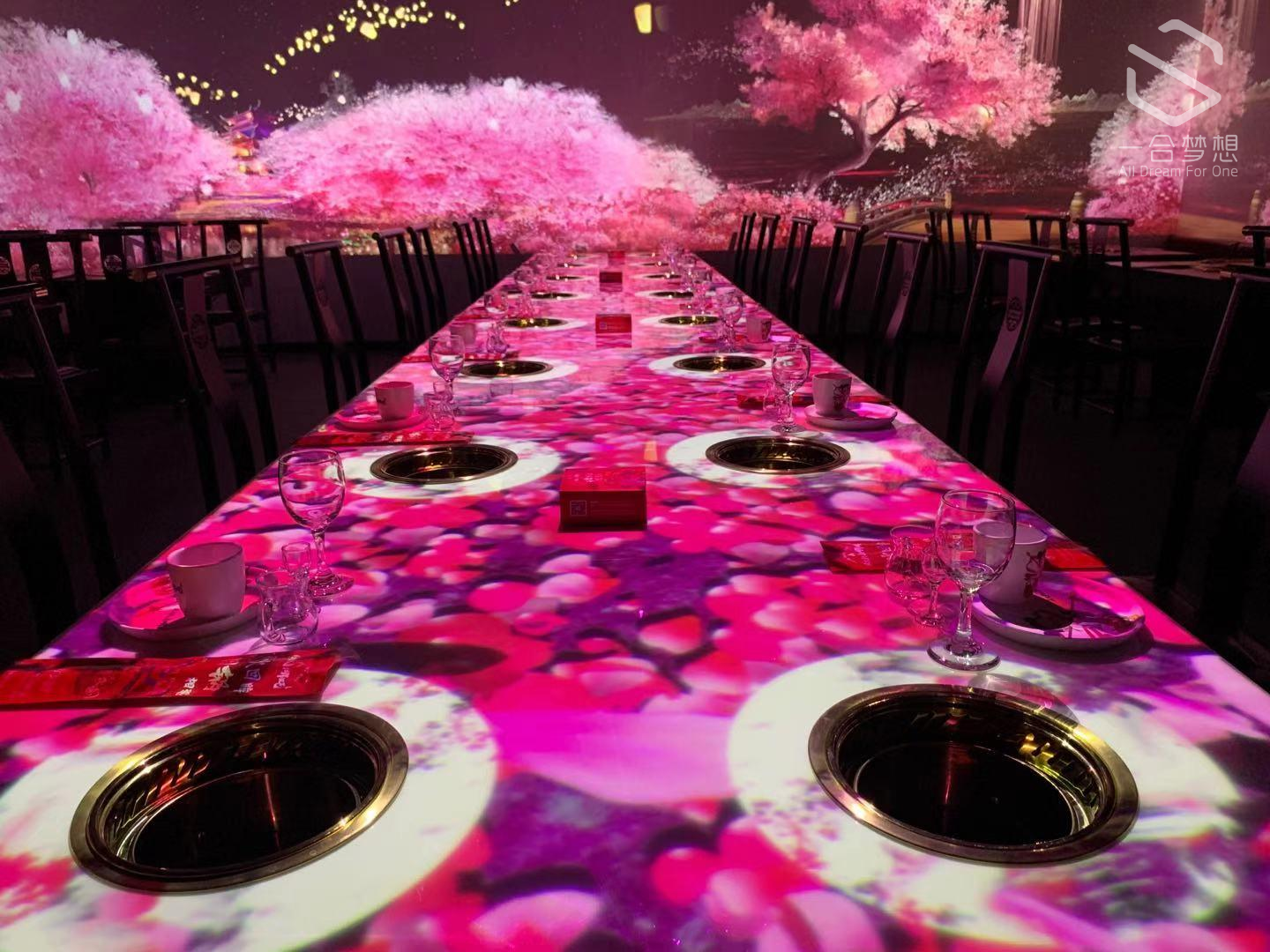 360°沉浸式光影餐厅,是一合梦想数字科技重要项目之一。前期利用3D投影技术对周围场景进行测量,利用3D软件进行1:1场景模拟和镜像模拟。利用个性化动画设计,通过4K灯泡投影机和工程激光投影机结合的方式投射在餐桌物品上,让用餐顾客可以通过灯光,图像,音乐,与用餐场景的互动,提高用餐的整体感受和气氛。